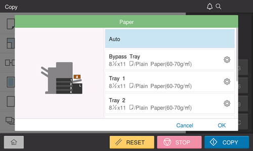 Selecting [Auto] automatically selects a tray that contains paper of the same size as the original.