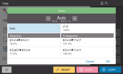 Fixed Zoom | Select a preset zoom ratio when copying a standard-size original onto standard-size paper. The paper tray is automatically exchanged depending on the selected zoom ratio. |