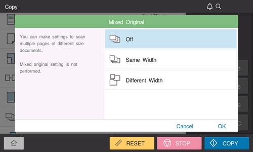 Even for an original with pages of different sizes, by using the ADF, you can scan data while detecting the size of each page. If the widths of the originals are the same, select [Same Width]. If the widths of the originals are different, select [Different Width].