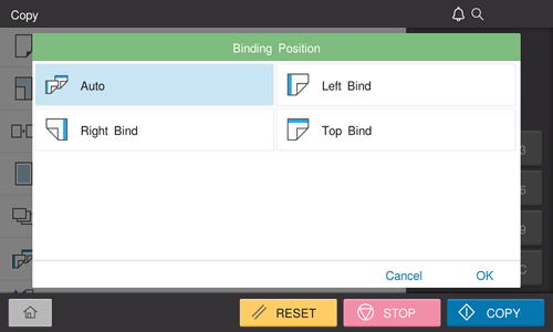 [Auto] | Automatically configures the binding position of the original. When the long side of the original is 11-11/16 inches (297 mm) or less, the binding position is set to the long side of the paper. When the long side of the original exceeds 11-11/16 inches (297 mm), the binding position is set to the short side of the paper. |