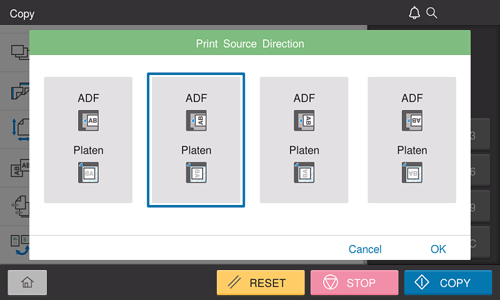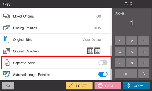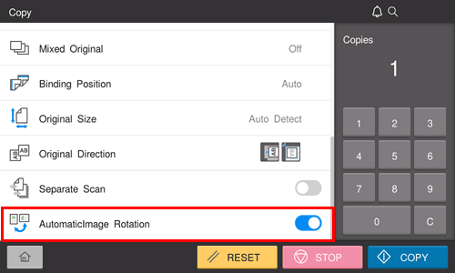 In general use, this machine automatically rotates the original image according to the paper direction to make a copy. Turning [Automatic Image Rotation] OFF as needed enables you to make a copy without rotating the original image. This function is available when you want to copy only a part of the original.