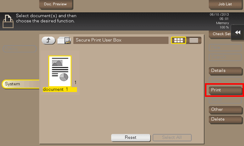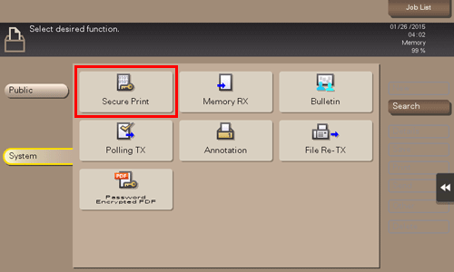 When simple printing for secure print document is enabled, select the target document ID from the document ID list. For details on the simple printing, refer to Here.