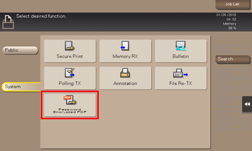 When printing or saving has completed, the file is deleted automatically from the Password Encrypted PDF User Box.