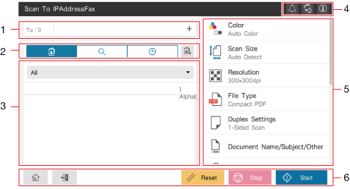 1 | Destination display area | Displays the number of specified destinations as well as destination information. When you tap the number of destinations or destination information, the destination list screen is displayed. You can check, edit, or delete the specified destinations. You can tap [+] to directly enter destination information and add a new destination. |