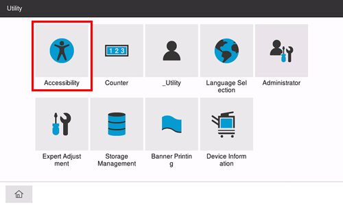 In [Accessibility] of [Utility], you can specify accessibility options of the operating environment such as the adjustment of the Touch Panel or a change of the keying sounds.