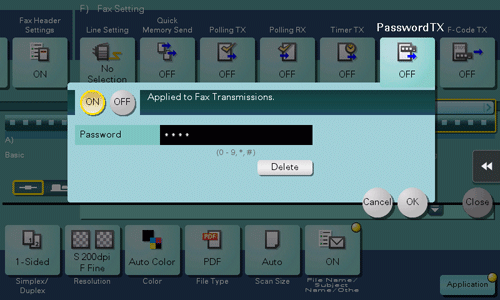 [ON]/[OFF] | Select [ON] to set Password TX. |