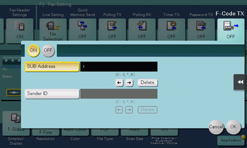 [ON]/[OFF] | Select [ON] to set F-Code TX. |