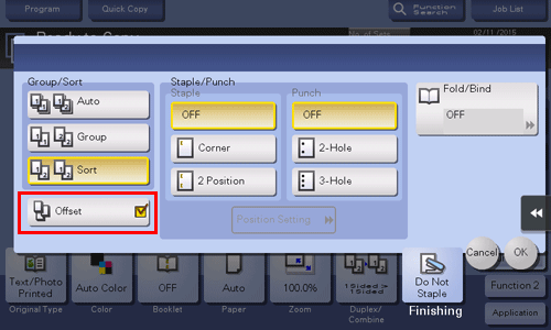 If the Finisher or Job Separator is installed, the copies are fed out and stacked on top of each other with each copy or page set staggered to separate them.