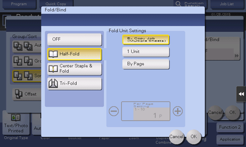 Feeds out a copied sheet by folding it in two. Also select the unit by which the paper is folded from [By Copy Job (Multiple Sheets)], [1 Unit], and [By Page]. When you set [By Page], specify the number of pages to be folded at one time.