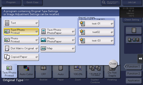 [Recall Image Adjustment Program] | Call the image quality adjustment program. The registered content of a program is applied. For the image adjustment program, you can register the settings of [Original Type], [Density], [Bkgd. Removal], [Text Enhancement], [Neg-/Pos. Reverse], [Background Color], [Color Adjust], and [Mirror Image]. For details on the registration procedure, refer to Here. |