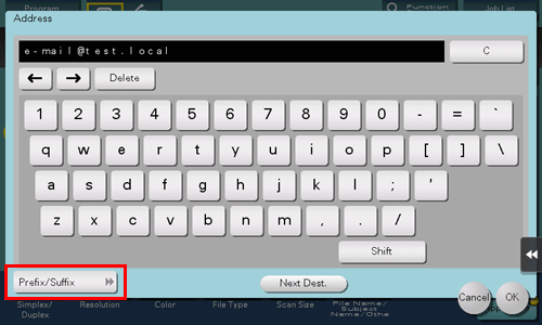 [Prefix/Suffix] is displayed when [Prefix/Suffix Setting] (Here) is set. You can recall a registered domain name etc. to complement entry.