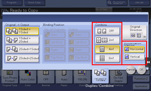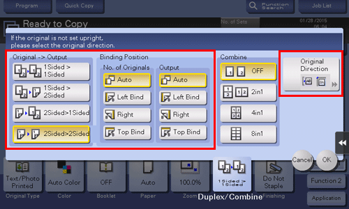 [Original > Output] | Select a combination of the original to be loaded (1-sided original or 2-sided original) and the copy method (1-sided copy or 2-sided copy). If you have selected other than [1Sided > 1Sided], also specify [Binding Position] and [Original Direction]. | |