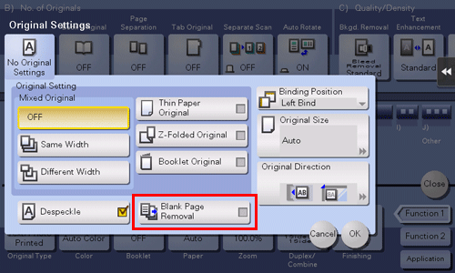 When [Blank Page Removal] is specified to scan an original including blank pages using the ADF, blank pages are excluded from scan targets. Blank pages detected are not counted as original pages.