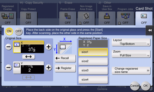 [Original Size] | Specify the size of a card to be copied. From the [Registered Paper Size], you can recall a size previously stored and specify the size. After you have entered the size, select a key in [Registered Paper Size], and tap [Register]. Then the size you have entered is registered in the memory. You can recall the registered size at a later date. |