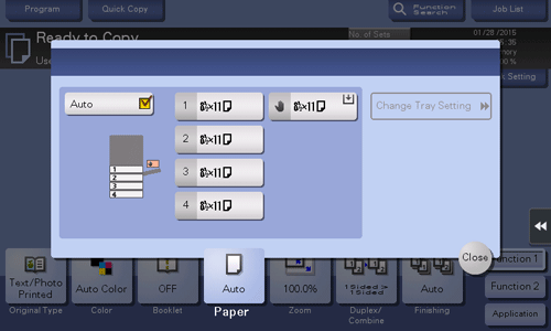Paper Tray | Specifies the paper loaded in the paper tray when making a copy. The displayed contents vary depending on the options installed on this machine. |