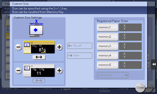 [Custom Size Settings] | Enter the length (X) and width (Y) of paper. Tapping the number entry area displays the Keypad. After you entered the size, select a key ([memory1] to [memory5]) in [Registered Paper Sizes], and tap [New]. Then the size you have entered is registered in the memory. You can recall the registered size at a later date. |