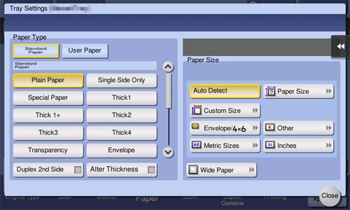 [Paper Size] | Select the size of the paper loaded in the selected paper tray. For details on the available paper sizes, refer to Here. Selecting [Auto Detect] automatically detects the size of the loaded paper. Selecting [Paper Size] allows you to specify the size that is measured using the ADF or Original Glass. For details, refer to Here. |