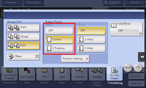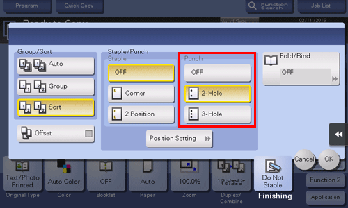 [Position Setting] | Select the punch position and original loading direction. If [Auto] is specified for the punch position, the punch position is determined automatically based on the direction of the loaded original. |