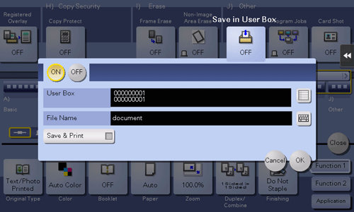 Saves original images in the User Box of this machine. You can also save an original in a User Box and print at the same time.