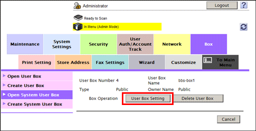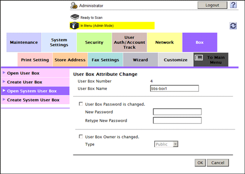 If you log in to the administrator mode, you can change settings for a registered Bulletin Board User Box or delete it without entering the password for the Bulletin Board User Box.