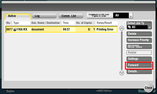 2. Select a job received using in-memory proxy reception, then tap [Forward].