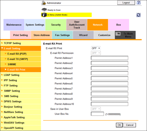[E-mail RX Permission ] | Select [ON] to restrict E-mail addresses that are available for the E-mail RX Print function. If you select [ON], in [Permit Address 1] to [Permit Address 10], enter the E-mail addresses for which you want to permit the E-mail RX Print function, or enter the E-mail domain. |