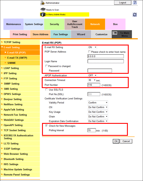 In the administrator mode, select [Network] - [E-mail Setting] - [E-mail RX (POP)], and configure the following settings.