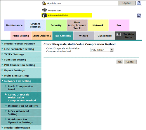 In the administrator mode, select [Fax Settings] - [Network Fax Setting] - [Color/Grayscale Multi-Value Compression Method], then configure the following settings.