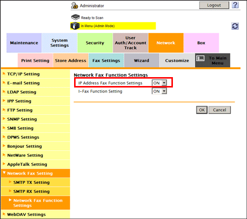 In the administrator mode, select [Network] - [Network Fax Setting] - [Network Fax Function Settings], and then set [IP Address Fax Function Settings] to [ON] (Default: [OFF]).