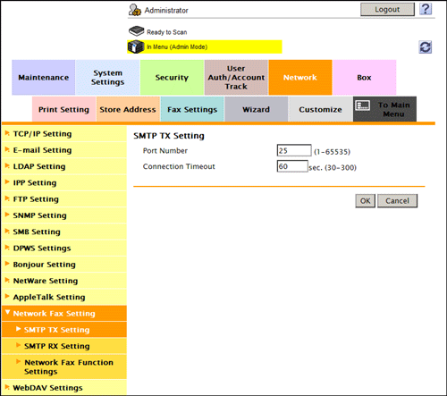 In the administrator mode, select [Network] - [Network Fax Setting] - [SMTP TX Setting], then configure the following settings.