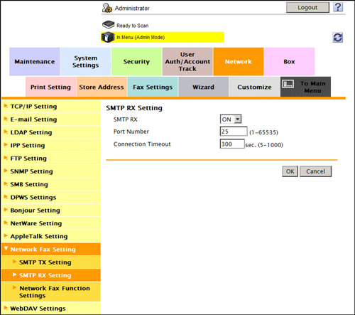 [SMTP RX] | Select [ON] to use the IP address fax function. [OFF] is specified by default. |