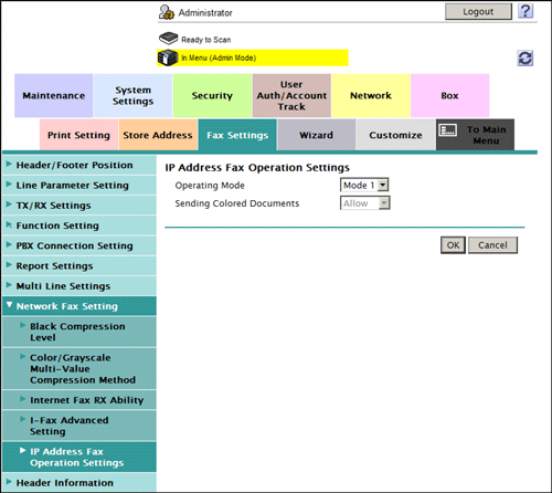 [Sending Colored Documents] | Select whether or not to accept sending of color faxes when selecting [Operating Mode ] for [Mode 2]. To send a fax to a machine that does not support color reception based on the Direct SMTP standard, select [Restrict]. [Allow] is specified by default. |