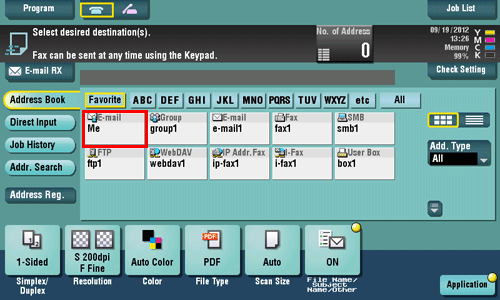 By selecting the [Me] key displayed in the [Address Book] screen, you can send E-mails to your E-mail address. If you log in to this machine that provides user authentication, the [Me] key appears in the [Address Book] screen. The [Me] key is assigned to an E-mail address of the login user. To use this function, you do not have to register your E-mail address in the address book.