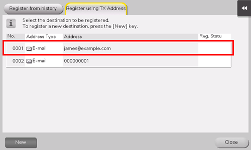 Tapping [New] allows you to register a new address, which is not yet entered. For details on how to register, refer to Here.