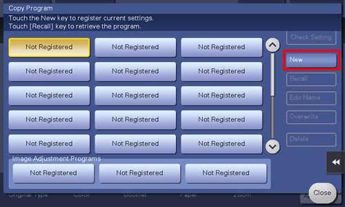 For image adjustment program, you can register the settings of [Original Type], [Density], [Bkgd. Removal], [Text Enhancement], [Neg-/Pos. Reverse], [Background Color], [Color Adjust], and [Mirror Image].