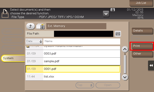 You can also print files by selecting the User Box mode and by tapping [System] - [External Memory].