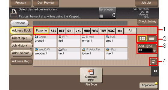 2 | Switches the display of the registered destinations to the button or list view mode. If the list view mode is selected, you can sort destinations by registration number, destination type, or registered name. |