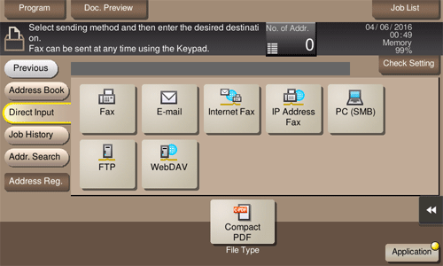 Tap [Job History], and you can select a destination from the scan or saved job history.