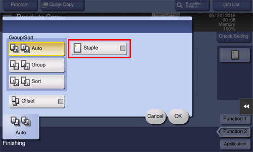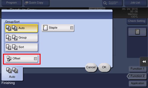 Automatically switches between Sort and Group according to the number of printed sheets for each set, and feeds out. If the number of printed sheets for each set is 1, the Group function is applied. If the number is 2 or larger, the Sort function is applied.