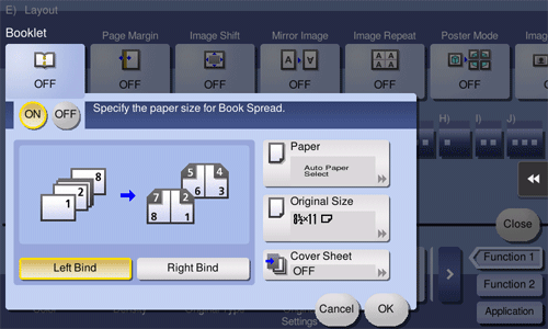 • You can simplify the setting operation by automatically enabling the Booklet function when the setting screen for [Booklet] is displayed. (Default: [OFF]) For details, refer to Here.