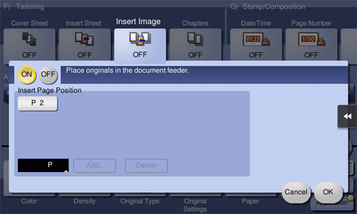 [Insert Page Position] | Specify a page number you want to insert a sheet into. The original is inserted after the page you have specified.