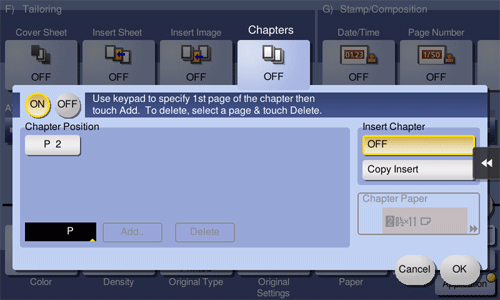 [Chapter Paper] | If [Insert Chapter] is set to [Copy Insert], select the paper tray where the Chapter Paper is stacked. If the chapter paper and text paper differ, use the same size of paper and stack them in the correct direction. |