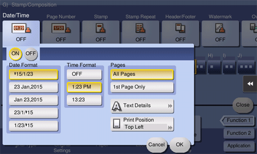 Select the stamping position and format, and add the date and time on copied sheets. The date and time can be printed either on all pages or only on the first page.