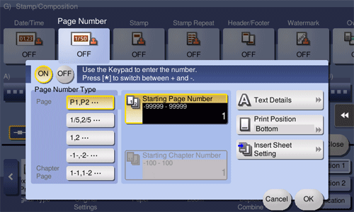 [Starting Page Number] | Enter the starting page number to be printed on the first page using the Keypad. To display the Keypad, tap the input area for the numeral. For example, to print page numbers from the third page of the original, enter "-1". The first page of the original is counted as "-1", and the second page as "0", and the third page is counted as "1". In [Starting Page Number], a page number is printed on pages 1 and later. If "2" is entered, page numbers are printed from the first page of the original as "2, 3", etc. in order. The "-" (minus sign) changes to + each time you tap [*]. |