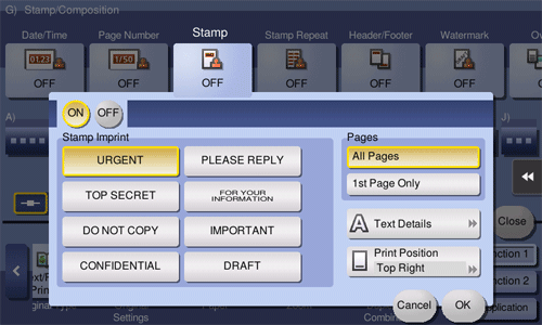 Text such as "PLEASE REPLY" and "DO NOT COPY" are printed on the first page or all pages. You can select the text to be printed from the registered fix stamps and arbitrary registered stamps.