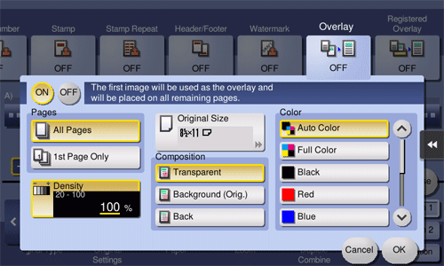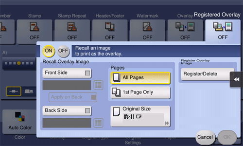 [Recall Overlay Image] | Specify which side of the paper to compose the overlay image, and select an overlay image to be composed. Check the density, composition method, preview, and other conditions of overlay image if necessary. If you set [Apply on Back], the image on the front side is composed on the back side of paper. |