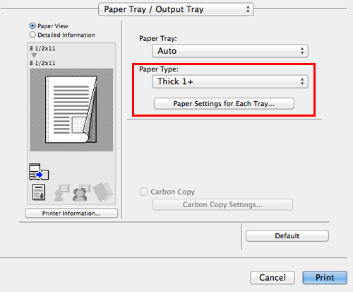 In [Paper Settings for Each Tray...], you can set a paper type for each tray. When you specify anything other than [Auto] in [Paper Tray:], the paper type information specified here is applied.