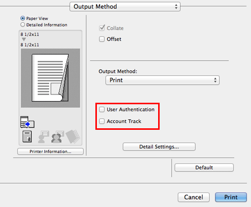 In the [Output Method] window, select the [User Authentication] check box (and the [Account Track] check box).