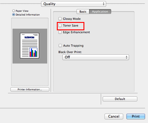 Selecting the [Toner Save] check box in [Quality] adjusts the printing density in order to save the amount of toner consumed.