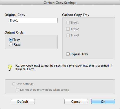 [Save Settings] | When the Save Setting check box is selected, the settings are saved. When the [Do not show this window when setting] check box is selected, this dialog box is not displayed when [Carbon Copy] is enabled. Using this function, you can save steps to configure settings the next time and after if you always specify the same carbon copy tray settings to execute a print job. |